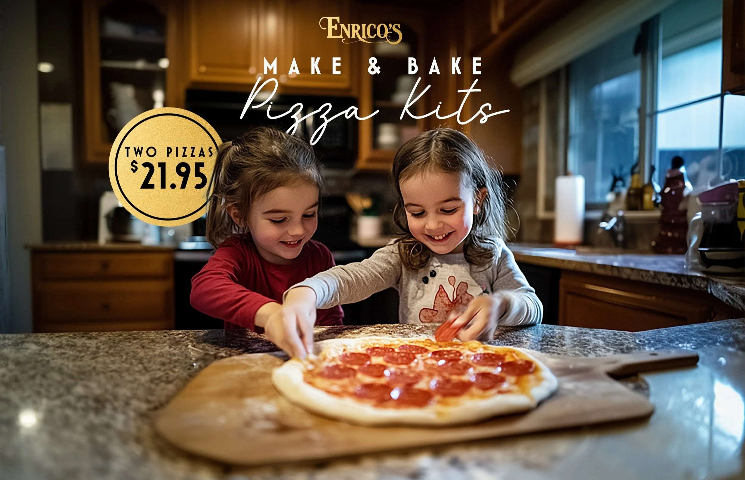 Now you can make Enrico’s pizza at home with yours! Our kits include everything you need to make two 12” homemade pizzas, just like we do.